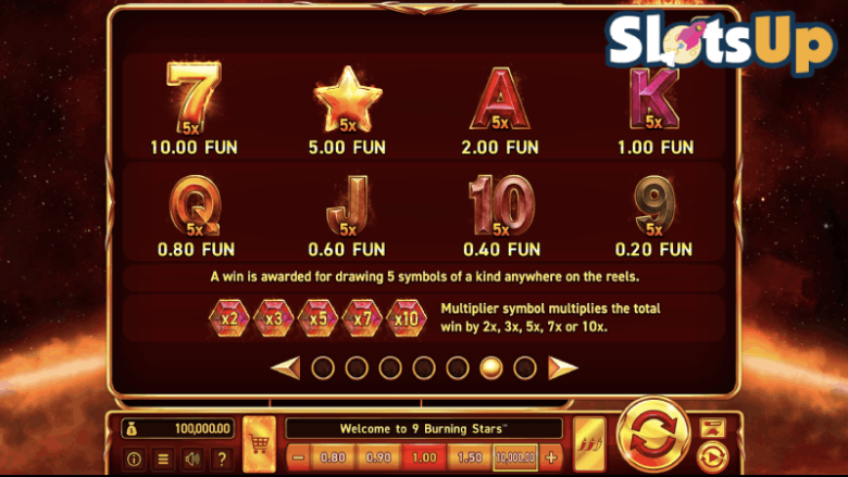 Jeśli chodzi o symbole, Wazdan nie zawarł w 9 Burning Stars niczego wyjątkowo tematycznego. Symbole kart do gry zaczynające się od 9 i biegnące do A reprezentują pierwsze dodatki. Dołączają do nich gwiazda i cyfra 7, przy czym ta ostatnia zapewnia najwyższe standardowe wypłaty w grze.