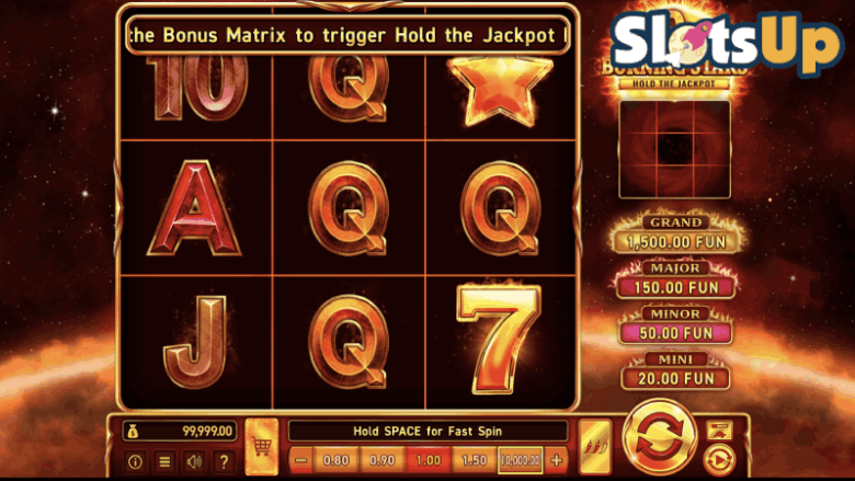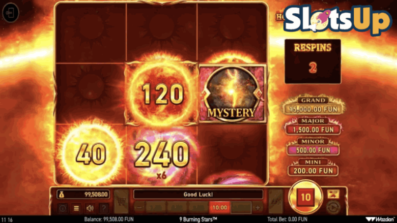 Podczas gry 9 Burning Stars na bębnach pojawiają się dodatkowe symbole. Są to płonące słońca z numerami. Są one następnie zapisywane w matrycy bonusowej znajdującej się w prawym górnym rogu ekranu gry. Po jej zapełnieniu aktywowana zostaje runda bonusowa Hold the Jackpot.Wszystkie zapisane symbole słońca kumulują się w jedną wartość i pojawiają się na środkowym bębnie podczas tej funkcji. Następnie otrzymujesz 3 obroty ponowne, a jeśli wylądują kolejne słońca, zatrzymają się i zresetują licznik obrotów ponownych do 3. Symbole jackpota Mini, Minor i Major również mogą wylądować i zrobić to samo. Przyznają one również odpowiedni jackpot.Podczas tej rundy symbol Mystery może również zmienić się w dowolny inny symbol bonusowy. Symbol Jackpot Mystery przekształca się w jeden z trzech symboli jackpota.Runda dobiega końca po zapełnieniu wszystkich pozycji lub gdy licznik obrotów ponownych spadnie do zera. Pokrycie wszystkich 9 pozycji symbolami bonusowymi zapewnia nagrodę Grand Jackpot w wysokości 1500-krotności zakładu.