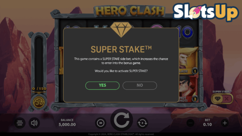 Jeśli grasz w Hero Clash slot za darmo, możesz oszacować szanse na wypadnięcie bonusów. Są one aktywowane losowo. Jest wyjątek - "Super Stawka". Gracze muszą tylko kliknąć na przycisk w prawym dolnym rogu ekranu.