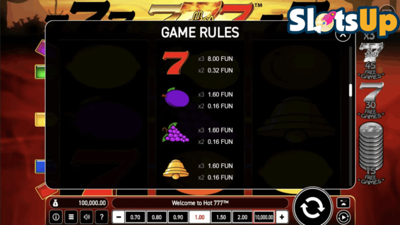 Z mojego doświadczenia w darmowym trybie demo mogę potwierdzić, że gra ma fajny i ekscytujący klimat. Uruchomiłem grę w przeglądarce i szybko przeskanowałem tabelę wypłat, aby zrozumieć wypłatę i sposób działania gry. Rozpocząłem moje pierwsze 100 obrotów Hot 777 ze stawką 3 i saldem 100 000 w trybie demo.