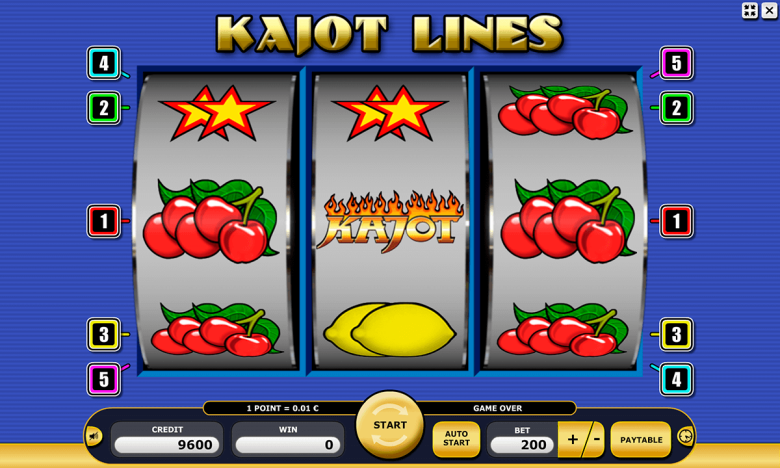 Kajot Lines to zachwycająca klasyczna gra kasynowa, która tchnie nowe życie w ponadczasowe automaty. Stworzony przez Kajot, ten automat online oferuje 3 bębny, 3 rzędy i 5 linii wypłat, oferując proste, ale wciągające wrażenia z gry. Zanurz się w świecie klasycznych obrazów i znacznych wygranych z każdym obrotem w tętniącej życiem grze Kajot Lines w kasynie online.