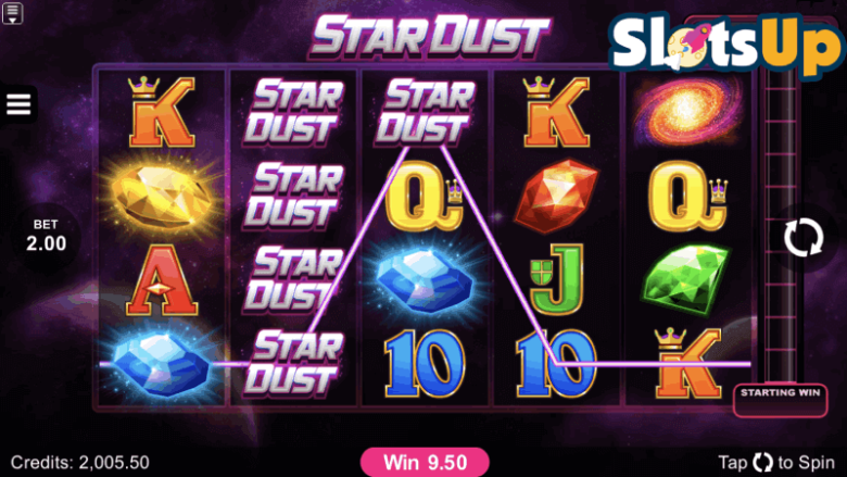 Eksploruj galaktykę na 40 liniach, zbierając klejnoty na bębnie 3, aby zapełnić miernik gwiezdnego pyłu. Uruchom 10 lub więcej zebranych klejnotów, aby odkryć cuda darmowych obrotów, w których czekają kosmiczne skarby. Wszystkie wygrane są wypłacane od lewej do prawej, a liczba obstawionych linii jest stała i mnożona przez stawkę na linię. Przeżyj dreszczyk emocji podczas każdego obrotu, ponieważ wypłacana jest tylko najwyższa wygrana na linię.