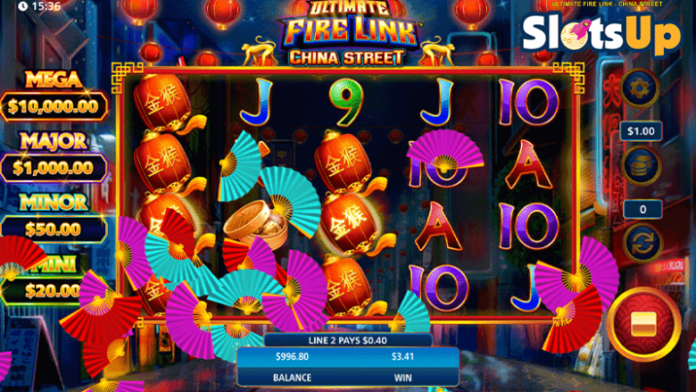 Mechanika Ultimate Fire Link, China Street jest łatwa do zrozumienia, z pięcioma bębnami i 50 liniami wypłat. Symbole Ultimate Fire Link, China Street obejmują ryby koi, latarnie, czajniki, symbole kart i parowiec. Papierowa latarnia jest dzikim symbolem i może zastąpić inne symbole z wyjątkiem symboli funkcji.