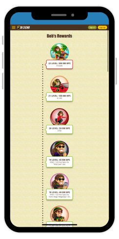 Program VIP składa się z 22 poziomów, a każdy poziom nagradza graczy darmowymi spinami lub bonusami pieniężnymi. Aby awansować na kolejne poziomy, gracze muszą zbierać punkty BP. Jeden BP jest przyznawany za każde 130 PLN postawione na automatach (inne rodzaje gier się nie liczą). Na przykład, aby osiągnąć poziom VIP 1, gracz musi zebrać 20 BP, co oznacza postawienie 2,520 PLN w zakładach na automatach. Za osiągnięcie tego poziomu gracz otrzymuje 10 darmowych spinów na slot "Bob's Coffee Shop".