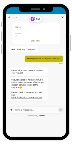 Przygotowując tę recenzję kasyna BobCasino, najczęściej komunikowałem się za pośrednictwem czatu na żywo. Podobało mi się, że przed połączeniem można wybrać język wsparcia. Jest to wygodne dla międzynarodowego kasyna. Agenci łączyli się natychmiast i bardzo szybko odpowiadali na szeroki zakres pytań.