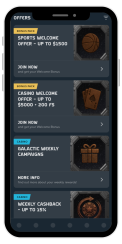 Gracze mają dostęp do bonusów kasynowych Galactic Bets: oferty powitalnej, cotygodniowych promocji, cotygodniowego Spinwheel, turnieju i cotygodniowego cashbacku.