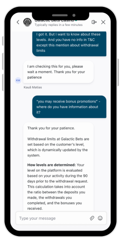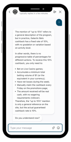 W witrynie znajduje się strona kasyna Galactic Bets z zasadami zwrotu gotówki i stwierdza, że gracze mogą otrzymać do 15%. Zainteresowałem się tym i skontaktowałem się z obsługą klienta, aby wyjaśnić dokładne warunki promocji i dowiedzieć się, jak sprawdzić dokładny procent cashbacku dla mojego konta. Agent odpowiedział: