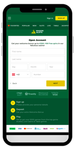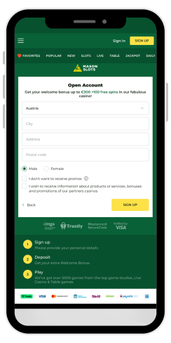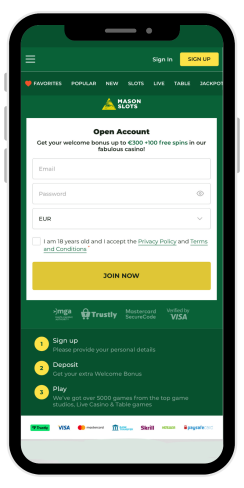 Rejestracja na stronie jest szybka i prosta. Zajęło mi to zaledwie kilka minut. Musisz wprowadzić informacje w kilku krokach, aby zalogować się do kasyna Mason Slots i do późniejszej weryfikacji.