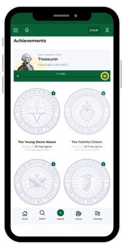 Program VIP w kasynie Mason Slots składa się z 20 osiągnięć. Po osiągnięciu każdego z nich gracz otrzymuje nagrody w postaci darmowych spinów i bonusowych pieniędzy. Na najwyższym poziomie (poziom 20) nagrodą jest podróż do miejsc masońskich. Aby odblokować Osiągnięcia, gracze muszą zbierać Punkty Comp. Możesz otrzymać 1 CP za każde 4 PLN w zakładach. Na przykład, aby zdobyć pierwsze osiągnięcie, The Young Stone Mason, musisz zebrać 300 CP, co oznacza 1,250 PLN w zakładach. Moim zdaniem kasyno ma przejrzysty i uczciwy program VIP w porównaniu z innymi witrynami.