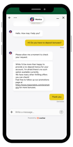 Przygotowując tę recenzję Mason Slots, zdałem sobie sprawę, że najszybszym sposobem uzyskania odpowiedzi od pomocy technicznej jest czat na żywo. Agent łączy się natychmiast i odpowiada bardzo szybko. Możesz również wybrać język polski jako język komunikacji. Uważam, że jest to bardzo dobrze zaprojektowane dla międzynarodowej publiczności.