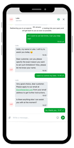 Kontaktowałem się z czatem na żywo wiele razy i nie do końca podobało mi się, jak to działa. Czat łączy się natychmiast i na początku trzeba komunikować się z botem kasyna Planbet, chociaż można nacisnąć przycisk, aby skontaktować się z operatorem. Operatorzy czatu na żywo byli dla mnie mało pomocni. Zadawałem pytania, a pierwszą rzeczą, którą wyjaśnili, było to, dlaczego pytam. Na przykład zapytałem o limity - mój cel był oczywisty, ale bez wyjaśnienia operator nie chciał kontynuować. Po udzieleniu wyjaśnień operatorzy często kierowali mnie do działu wsparcia przez e-mail. W rezultacie spędziłem czas na czacie na żywo, kiedy lepiej byłoby od razu napisać e-mail.
